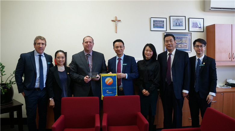 (圣奧古斯丁)集團領導與圣奧古斯丁校長合影留念并贈送印有深圳遠恒佳logo的紀念品,隨后與校方代表就國際教育項目進行深入交流