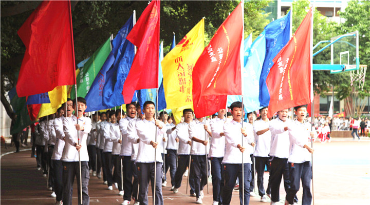 上午8:30,入場式正式開始。首先入場的是國旗、團旗、校旗護衛(wèi)隊,他們由高中國旗班全體成員組成。接著是會徽、標語牌引導隊,緊隨其后的是