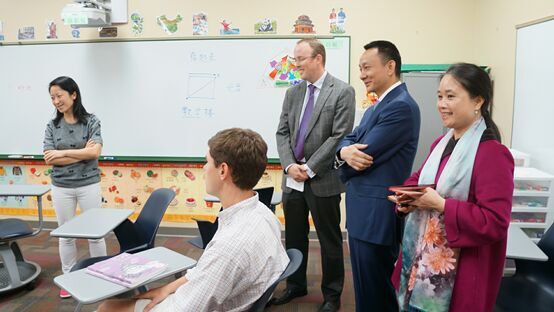 當日下午,宋總麥總一行來到當地另一家公立高中Godwin High School進行友好訪問,受到了Godwin學校教學總監的熱情接待。宋總、麥總一行參觀了學校的體育設施和教室等,被該校對學生的課外培養課程深深吸引。學校開展一系列的課外課程,如攝影社、交響樂社、木工社、繪畫社、英國文學社、辯論社等,豐富了學生的課余生活。同時,該校對學生的基礎課程也毫不松懈,該校歷屆畢業生都有獲得美國前十大學的錄取。考察團一行深入到教學課堂,與學生進行親切交流。