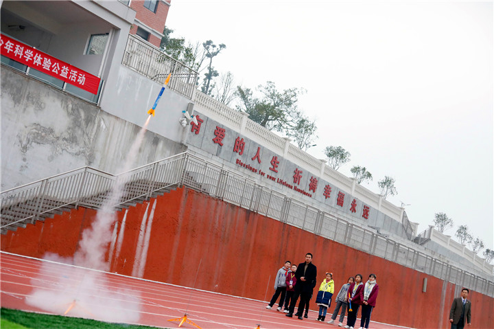 “嗖”“嗖”“嗖”……學校航模隊在奧體中心進行了火箭發射表演,一枚枚火箭騰空而起,在天空打開美麗的傘花,在同學們的歡呼聲中徐徐降落。