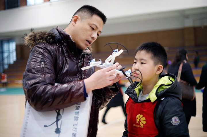 緊跟著起飛的數架無人機又迅速吸引了來賓的眼球,在航模隊員的遙控下,無人機不斷在同學們面前飛過,時而懸停,時而旋轉上升,時而來個漂亮的空滾翻……此起彼伏的喝彩聲響徹天空。