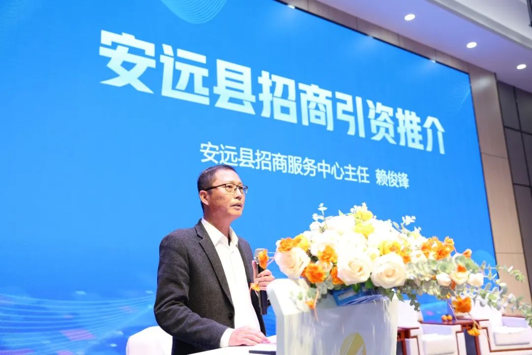 安遠縣招商服務中心賴俊鋒主任進行了招商推介活動,介紹了安遠的區位優勢、產業政策、重點產業等,號召大灣區的企業家們“投資安遠,安行致遠”。