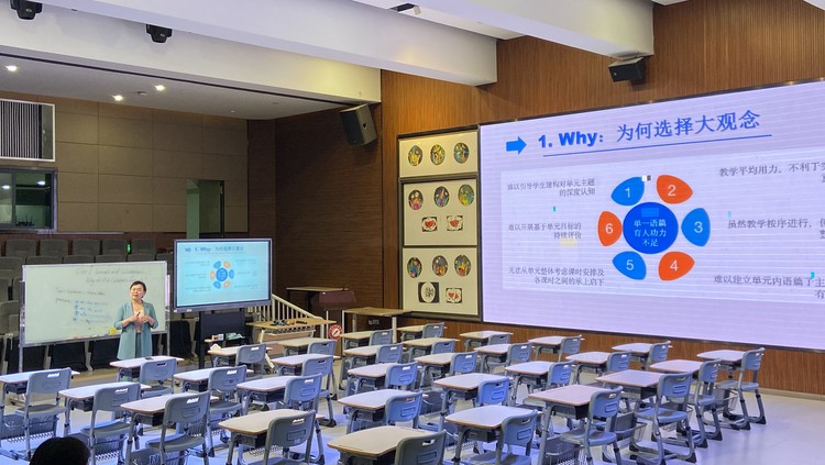 最后,長壽區英語教研員任莉娜老師作了《關于大觀念統領下單元整體教學的解讀》的專題講座。她從Why-為何選擇大觀念,What-何為英語學科大觀念,How-如何基于大觀念教學設計三個方面具體地剖析了大單元教學環境下的教學思路,技能策略以及幫助學生認知結構的建構,情感態度的培養等。