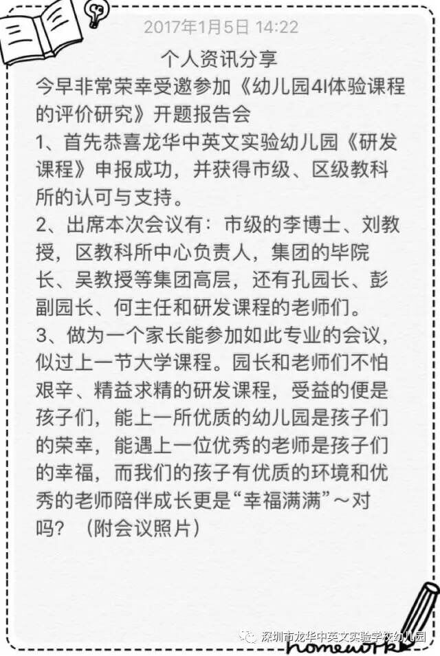 2017年1月5日上午10:00—11:30,龍華中英文實驗學校幼兒園在龍華中英文實驗學校三樓培訓室召開深圳市教育科學“十三五”規劃2016年招標課題《幼兒園“4I”體驗課程的評價研究》開題報告會。